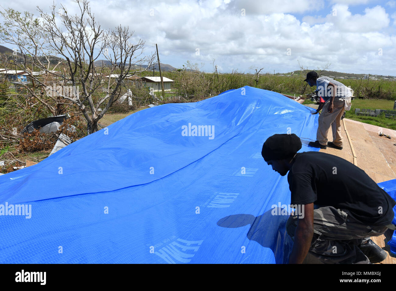 The first residential temporary roof made of blue plastic sheeting was installed today on the island of st.